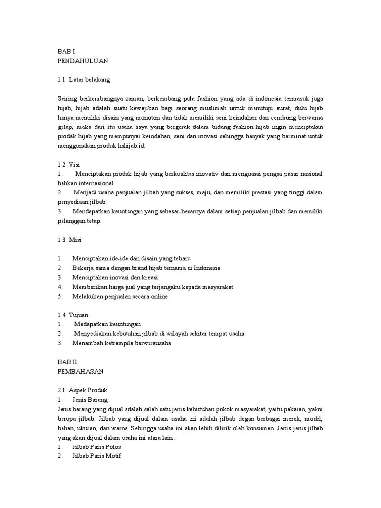 Bisnis Plan Jilbab Shop Pdf Download Gratis from docplayer.info Latar belakang bukittinggi merupakan sebuah kota yang berada di sumatera. Produk hijab zoya di butik zoya pamularsih. 2.3 keterkaitan dengan produk lain termasuk perolehan bahan baku ……………3. Pendahuluan 1.1 latar belakang kebutuhan jilbab sangat penting dan merupakan. 4 hermawan kertajaya dan syakir sula, marketing perbankan . Contoh latar belakang untuk proposal produk kerudung : Persentase bisnis hijab yang ada di jawa barat / hijab lukis alamat perusahaan :. Permasalahan lingkungan yang sering terjadi dewasa ini telah menjadi permasalahan yang mengancam, tidak hanya kelangsungan hidup dari .